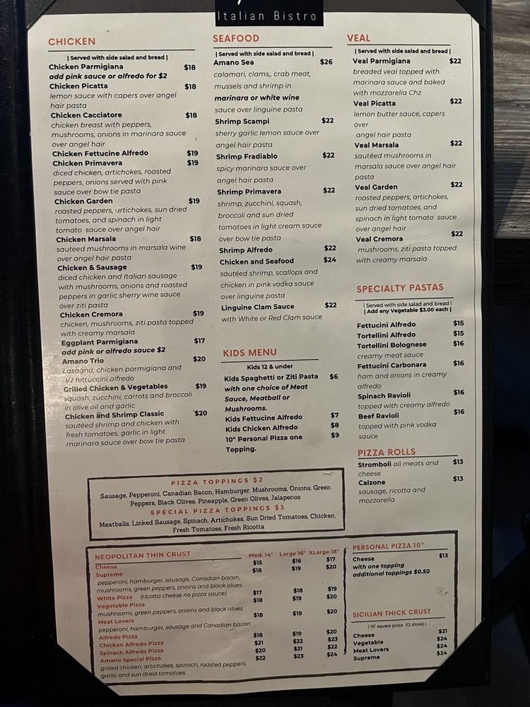 Don't miss out on customer favorites like the Shrimp Fra Diavolo, which delivers a perfect heat, or the Chicken Piccata, swimming in buttery lemon sauce. With outdoor seating available, it's an ideal spot for a laid-back evening. Let Amano Italian Bistro elevate your dining experience!